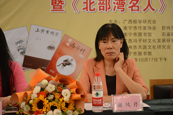 钦州市作协主席谢凤芹介绍了《北部湾名人》的创作情况,广西桂学研究会副会长容本镇出席会议作主旨发言,南宁、钦州两地作家、评论家近40人参加。会议由广西作协副主席、南宁市作协主席、南宁文学院院长、《红豆》杂志社社长丘晓兰主持。与会专家对谢凤芹创作的《北部湾名人系列》作品给予了充分肯定。