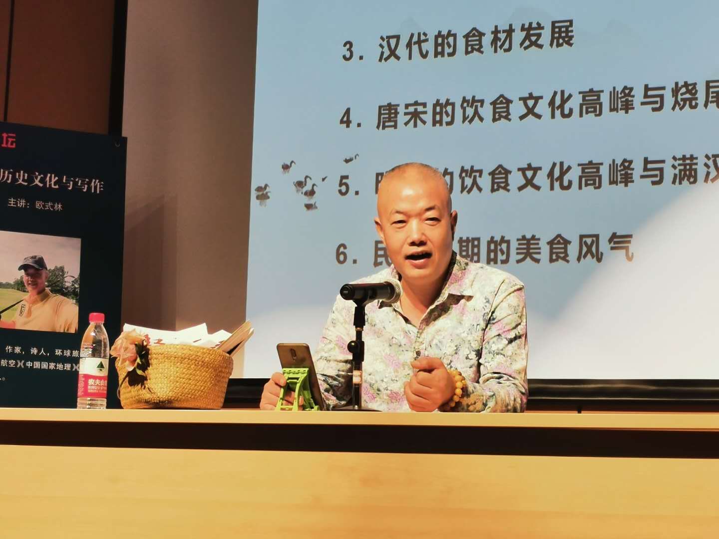 讲堂上,欧式林畅谈“饮食历史文化与写作”,回顾我国的饮食发展历史,探讨不同时代的饮食现象。他表示,饮食有无数值得深入的话题,值得作家们,尤其是散文作家和小说家们关注与深入探讨。