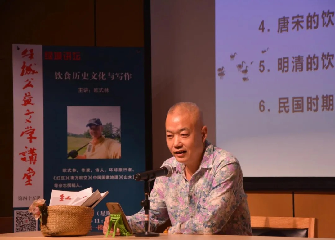 讲堂上,欧式林回顾我国的饮食发展历程,探讨不同时代的饮食现象。他表示,饮食有无数值得深入的话题,值得作家们,尤其是散文作家,和小说家们关注与深入!