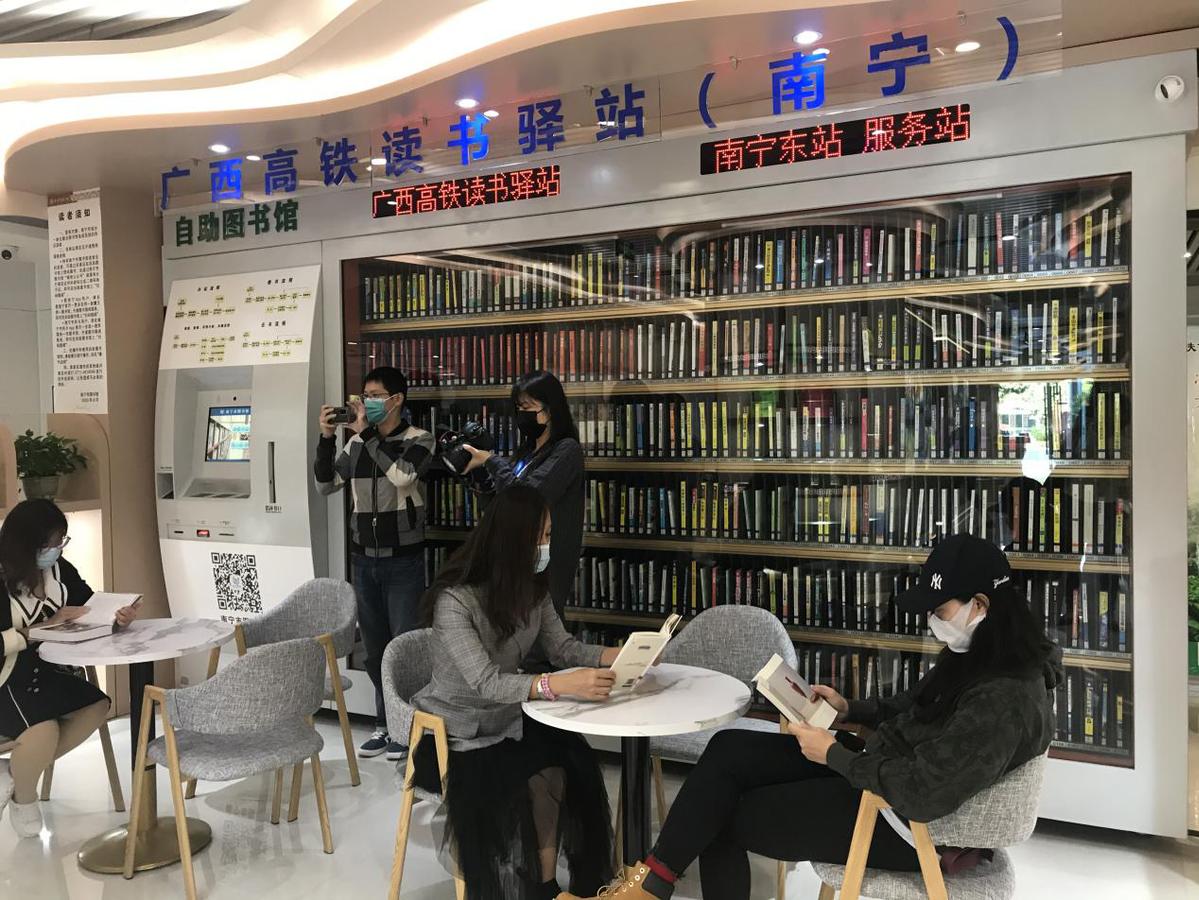 首批“高铁读书驿站”主要在北部湾图书馆联盟城市的高铁站候车厅或高铁集散中心试点建设,目前已在南宁、北海、钦州启用。旅客自助免押金办理借书证或验证身份证后,便可自由借阅书刊,并可在联盟城市图书馆或读书驿站异地归还。“高铁读书驿站”使文化随着四通八达的高铁网络流动起来,高铁车站不仅成为旅客的现代“歇脚驿站”,也成为促进文化传播的“文化驿站”。