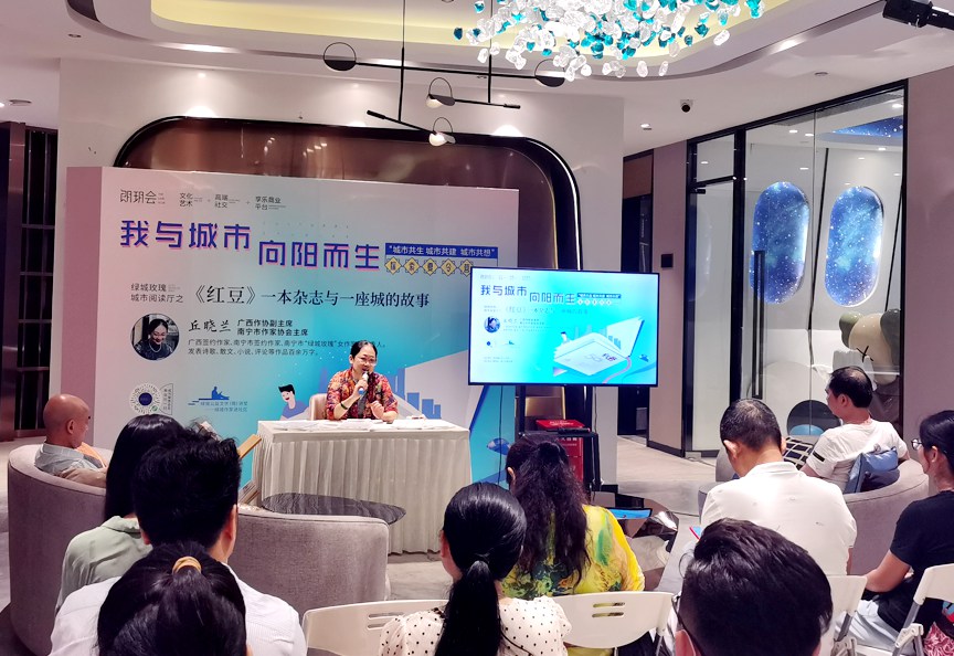 7月9日,“我与城市 向阳而生”绿城玫瑰城市阅读厅主题活动在南宁举行。广西作协副主席、南宁市作协主席丘晓兰从一本文学杂志与一座城的故事说起,着重提到了文学的温暖与光芒不仅可以照进人心,也会与我们生活着的城市交相辉映,焕发更明亮的神采。