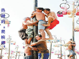 每年8月17日是印度尼西亚国庆日,全国各地都会举办各种庆祝活动,最有意思的要数爬槟榔印尼语“panjatpinang”)了。比赛用的槟榔树一般高约5米,事先被刨去树皮,再涂上一层厚厚的棕榈油,顶端挂着衣服、自行车、电视机、书籍、水桶等物品。