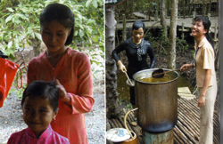 6点30分,手持请柬的嘉宾纷纷乘车而不是自驾摩托车赶来,大门口先有新人在影楼合影时的微笑。人们依次缓慢步入,要耐心等待一个简单却缓慢的程序——先签到、再将由请柬已变成红包的信封轻轻插进一个花篮内,(这份彩礼据小徐说相当于人民币100—200元。)其神态如同选举时投那“庄严的一票”。这一切规定动作,不仅有接待小姐的亲眼公证,还都有摄像机和照像机的双重记录。