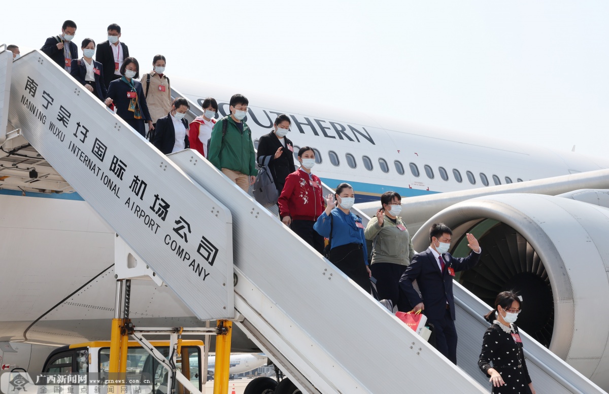 10月24日上午,出席中国共产党第二十次全国代表大会的广西代表团,在圆满完成大会各项任务后离京返桂,于11时许抵达南宁。记者 黄克 摄
