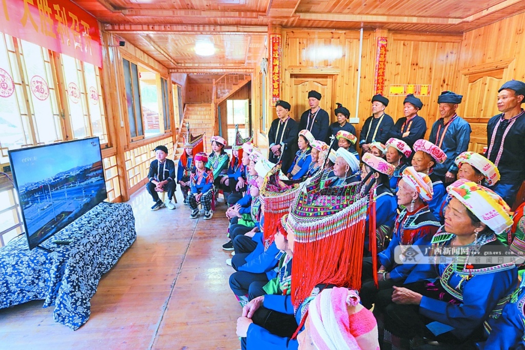 10月16日,桂林市灵川县九屋镇东源村瑶族同胞身着民族盛装收看党的二十大开幕会盛况。阳宁红 黄勇丹 摄