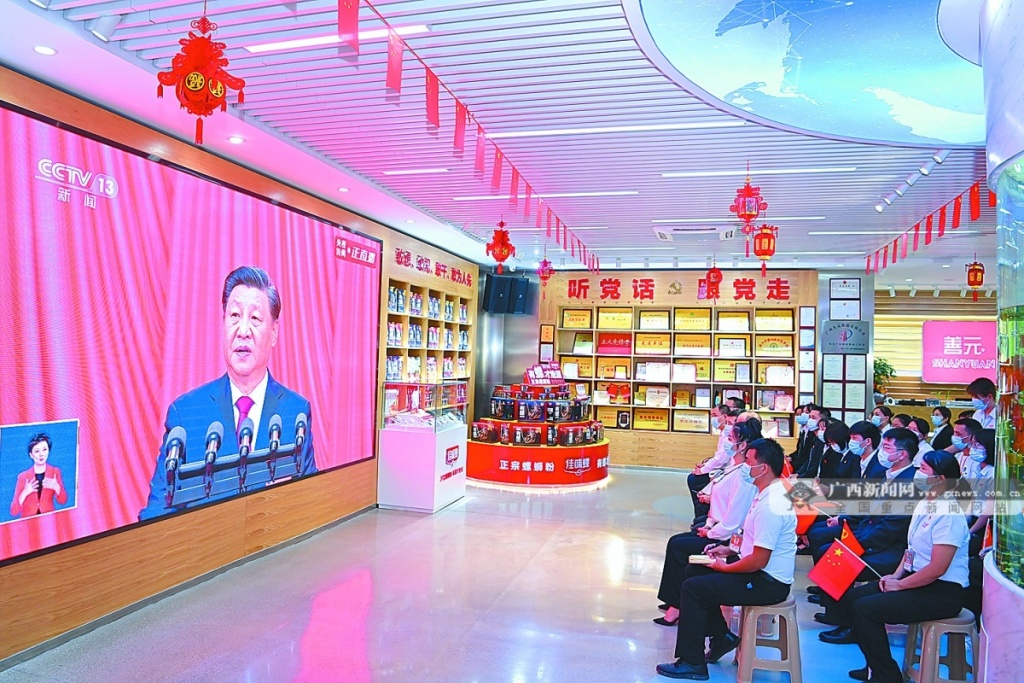 10月16日,在习近平同志曾经视察过的柳州螺蛳粉生产集聚区,党员干部和一线职工集中收看党的二十大开幕会。黄蕊 摄