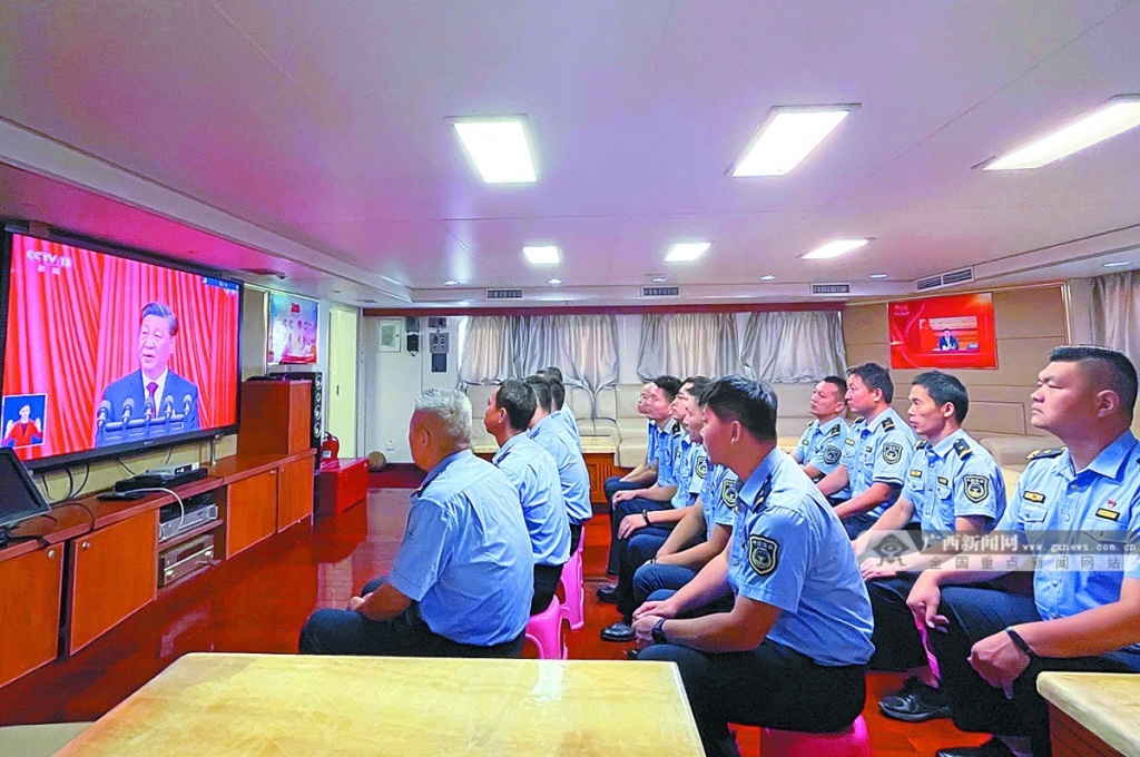 10月16日,中国海监广西壮族自治区总队派出“中国海监1118”船在北部湾海域开展海上巡航执法行动,该船执法人员集中收看党的二十大开幕会。蓝海 摄