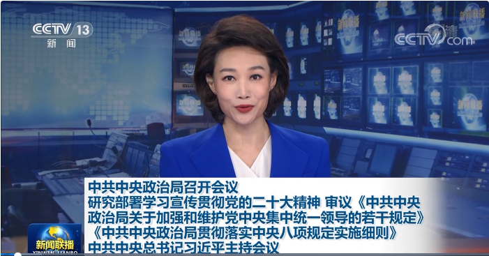 会议强调,坚持和加强党中央集中统一领导是全党共同的政治责任,首先是中央领导层的政治责任。中央政治局要带头严格遵守党章和党内政治生活准则,全面落实党的二十大关于坚持和加强党中央集中统一领导的各项要求,深刻领悟“两个确立”的决定性意义,增强“四个意识”、坚定“四个自信”、做到“两个维护”,带头全面贯彻习近平新时代中国特色社会主义思想,不断提高政治判断力、政治领悟力、政治执行力,自觉在思想上政治上行动上同以习近平同志为核心的党中央保持高度一致,带领全党全国各族人民为全面建设社会主义现代化国家、全面推进中华民族伟大复兴而团结奋斗。