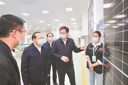 11月16日,自治区主席蓝天立深入南宁市宣讲党的二十大精神并开展调研。蓝天立走进广西晶飞能源科技有限公司,察看光伏太阳能组件生产线,勉励企业加大研发力度,持续提升产品竞争力。本报记者 邓 华/摄
