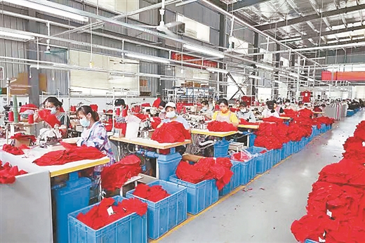 位于隆安县农民工创业园里的广西兴富制衣有限公司车间内,工人有序作业。 黄永福/摄