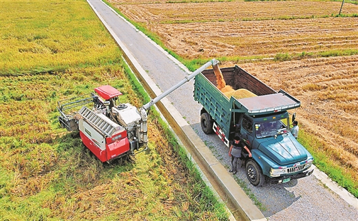 坛洛镇高标准农田喜获丰收,收割机将金灿灿稻谷装上车。 坛洛镇政府供图