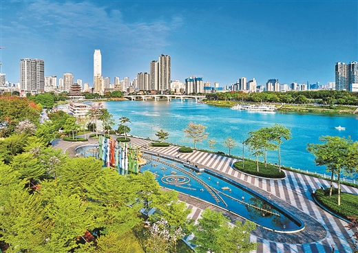 民生广场,蓝天绿水美如画。 黄伟铭/摄