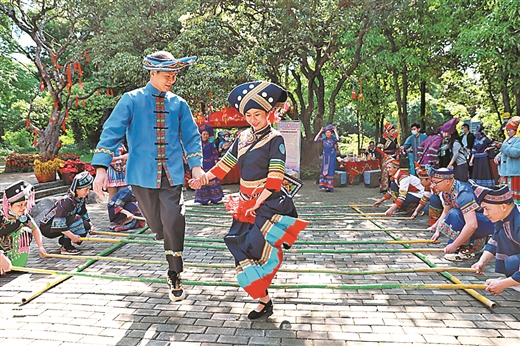 在2022年南宁市武鸣区“壮族三月三”民俗文化展示活动上,壮乡儿女载歌载舞庆佳节。 梁 挺/摄