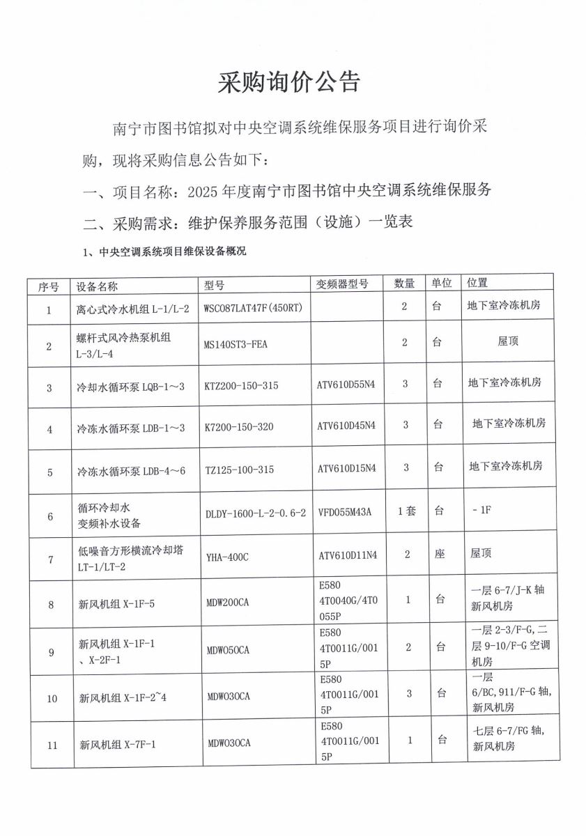 南宁市图书馆拟对中央空调系统维保服务项目进行询价采购,现将采购信息公告如下: