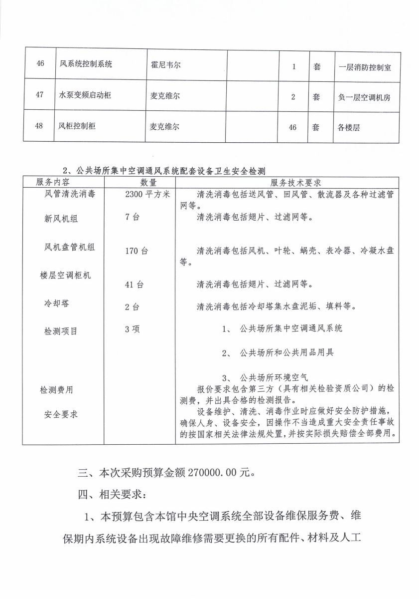 1、本预算包含本馆中央空调系统全部设备维保服务费、维保期内系统设备出现故障维修需要更换的所有配件、材料及人工费用。