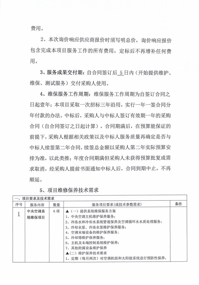 4、维保服务工作周期:维保服务工作周期为自签订合同之日起壹年;本项目采取一次招标三年沿用,实行一年一签合同分年付款的办法。中标后,采购人与中标人签订有效期一年的采购合同(自合同签订之日起计算)。合同期满后,在预算能保证的前提下,采购人根据相关政策以及中标人服务质量再确定是否与中标人续签第二年合同,续签总金额以采购人第二年实际预算安排为准,以此类推;年度合同期满但采购人未获得预算批复或需求取消,经采购人提前书面通知中标人后,合同到期中止,不再顺延。