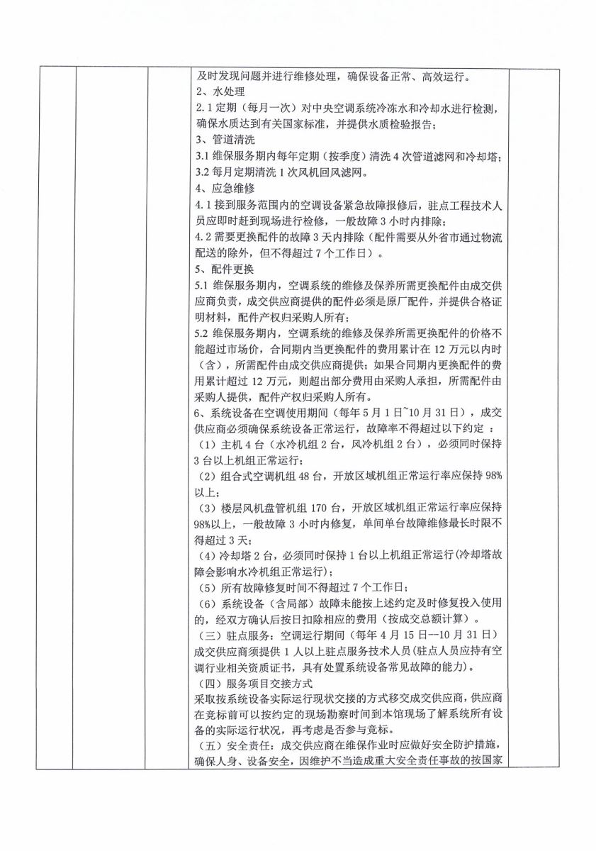 5.1维保服务期内,空调系统的维修及保养所需更换配件由成交供应商负责,成交供应商提供的配件必须是原厂配件,并提供合格证明材料,配件产权归采购人所有;