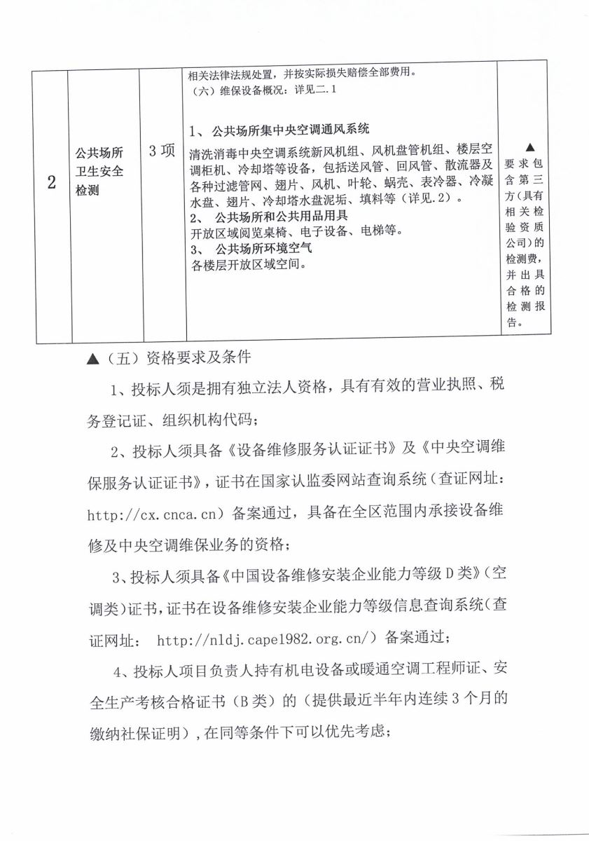 2、投标人须具备《设备维修服务认证证书》及《中央空调维保服务认证证书》,证书在国家认监委网站查询系统(查证网址:http://cx.cnca.cn)备案通过,具备在全区范围内承接设备维修及中央空调维保业务的资格;