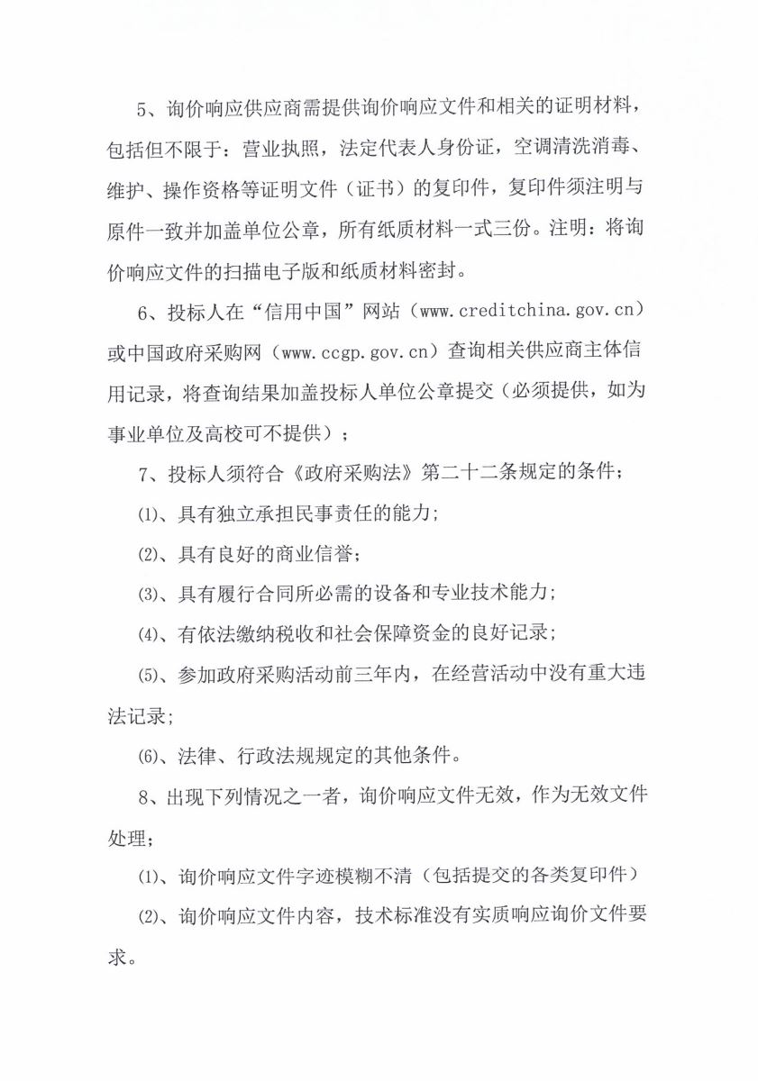 5、询价响应供应商需提供询价响应文件和相关的证明材料,包括但不限于:营业执照,法定代表人身份证,空调清洗消毒、维护、操作资格等证明文件(证书)的复印件,复印件须注明与原件一致并加盖单位公章,所有纸质材料一式三份。注明:将询价响应文件的扫描电子版和纸质材料密封。