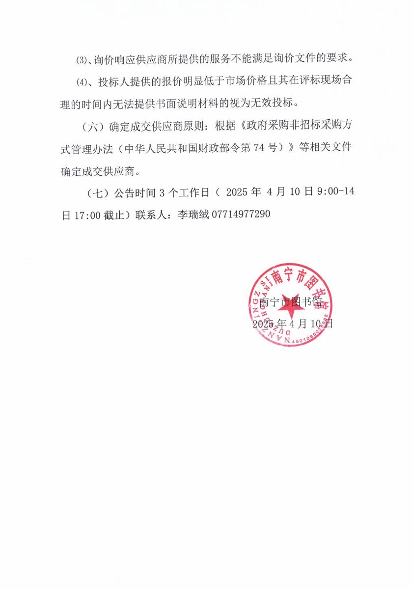 (七)公告时间3个工作日( 2025年 4月10日9:00-14日17:00截止)联系人:李瑞绒07714977290